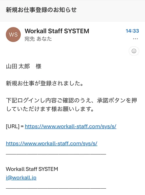 スケジュール登録をした勤務日の前日午後5時までに『新規お仕事登録のお知らせ』というメールが届きます。