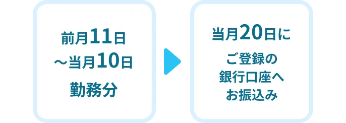 - 2024年11月1日から2025日1月26日勤務分は2月20日(木)に登録口座にて全額お振込みいたします。