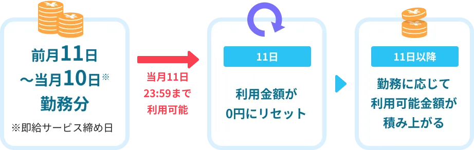 - 前月11日~当月10日までの勤務分が即給サービス利用可能額として積み上がります。