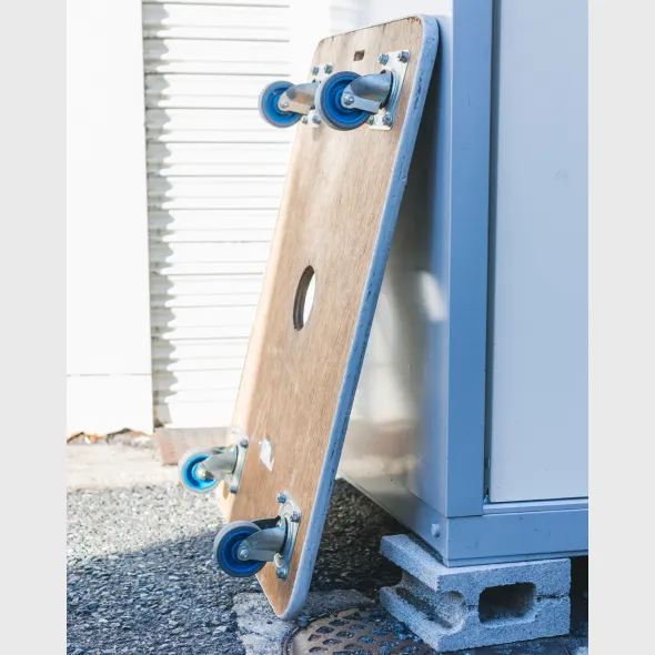 使用しない時は、台車を裏返し壁に立てかけてください。ただし、仕上げ材に直接立てかけると傷が付く可能性があるため、直接立てかけないでください。