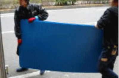 - 2人で運搬する際は、後ろ向きの人が壁に接触しないよう、台車の舵取りを慎重に行ってください。
