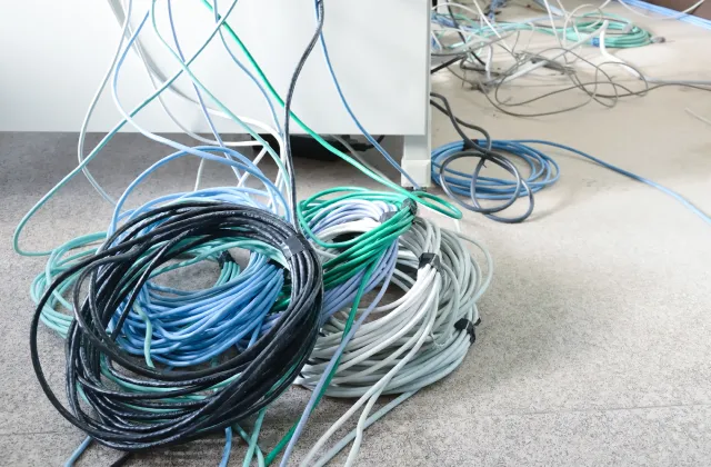 配線が複雑に絡まっている机や棚が見られます。